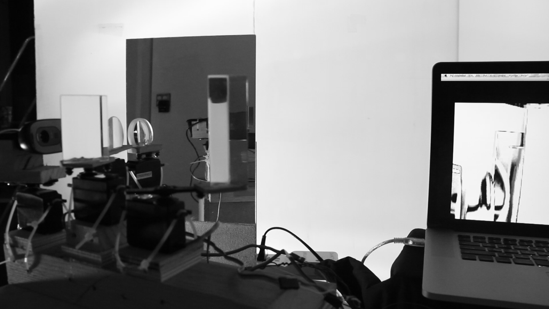 “Perceptron” is an autonomous video feedback system using concave and convex lenses, prisms, servo motors, and digital filters.
